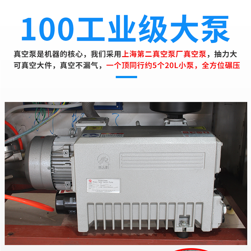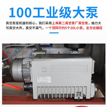 該機采用國內知名品牌上海第二真空泵產生產的工業級大泵,引起德國普旭技術,部分核心部件為全進口,關鍵部位材質含有微量金屬元素,真空泵壽命更持久,其中真空油為專業配方,耐高溫,比傳統真空泵油更耐用。抽氣速率為100m3/H,