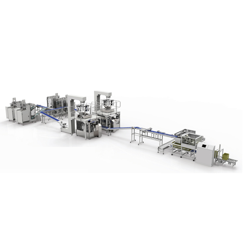 2、生產線配置有立式包裝機若干臺+小包整理輸送線+斗式提升機+電腦組合秤+電子稱架