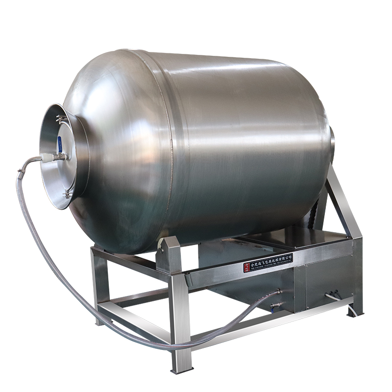 真空滾揉機筒體采用SUS304不銹鋼材質制作,圓筒狀設計使滾揉空間加大,運行噪音小,三片漿葉圓弧形設計,使腌料與原料肉分布均勻,避免了對原料肉表面的傷害。防水電腦版控制柜與時間繼電器控制結合,方便客戶根據自己的生產工藝要求調節滾揉時間、靜汁時間。整機外觀采用表面鏡面拋光處理,外觀整潔、大方。